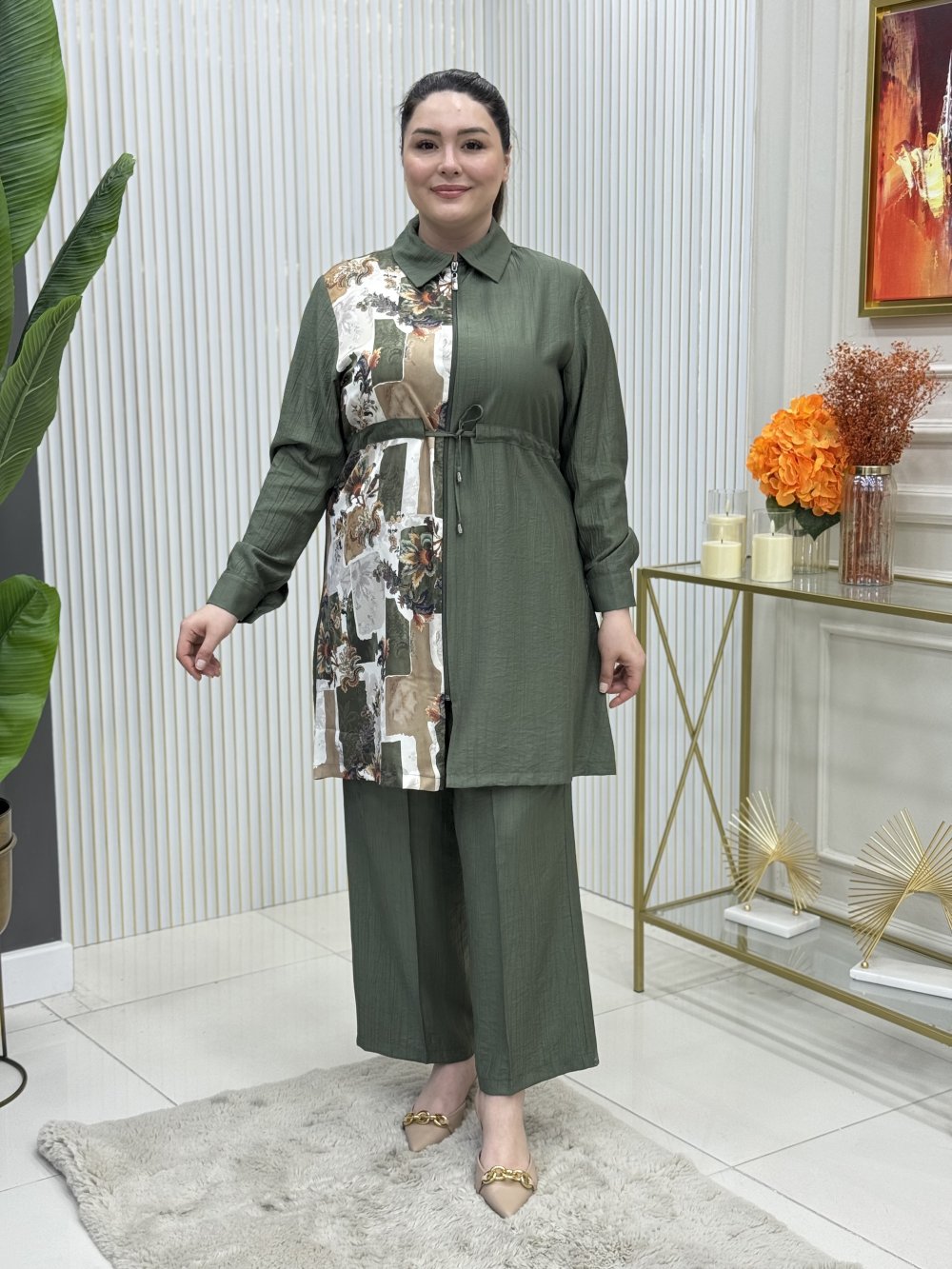 Tunik kolları düğmeli, belden ayarlanabilir büzgülü.