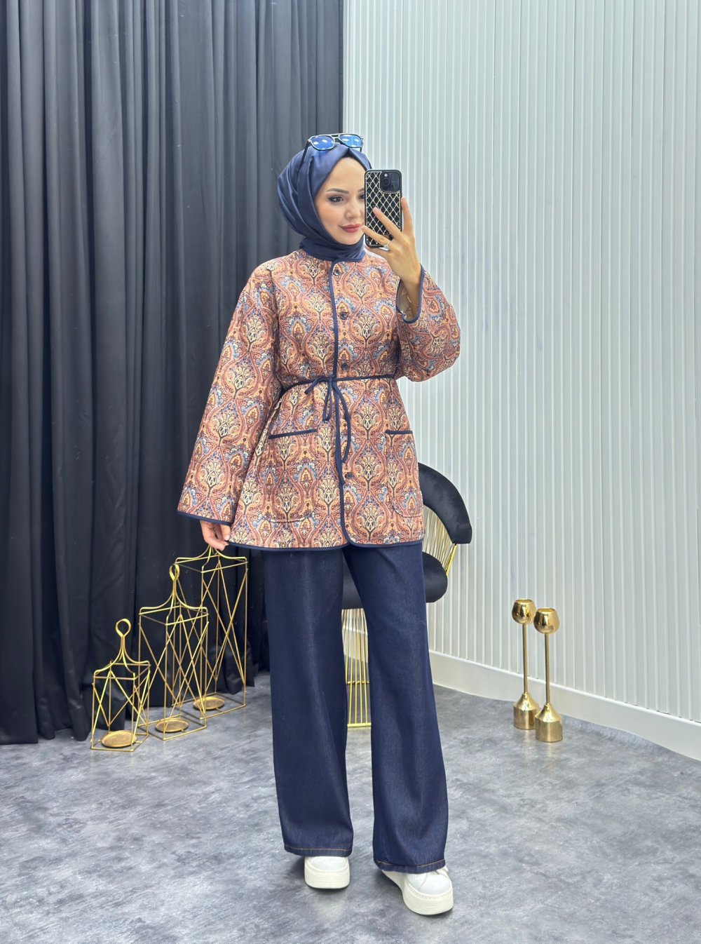 kemerli çift cep detaylı boydan düğmeli bohem kapitone ceket