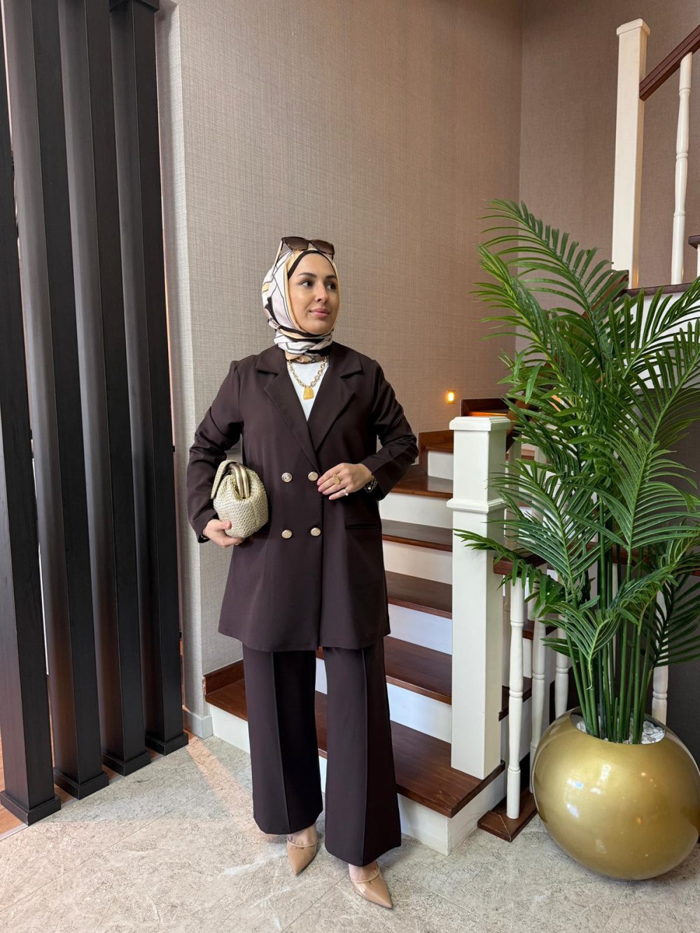 Gold Düğmeli Ceket Takım Kahverengi