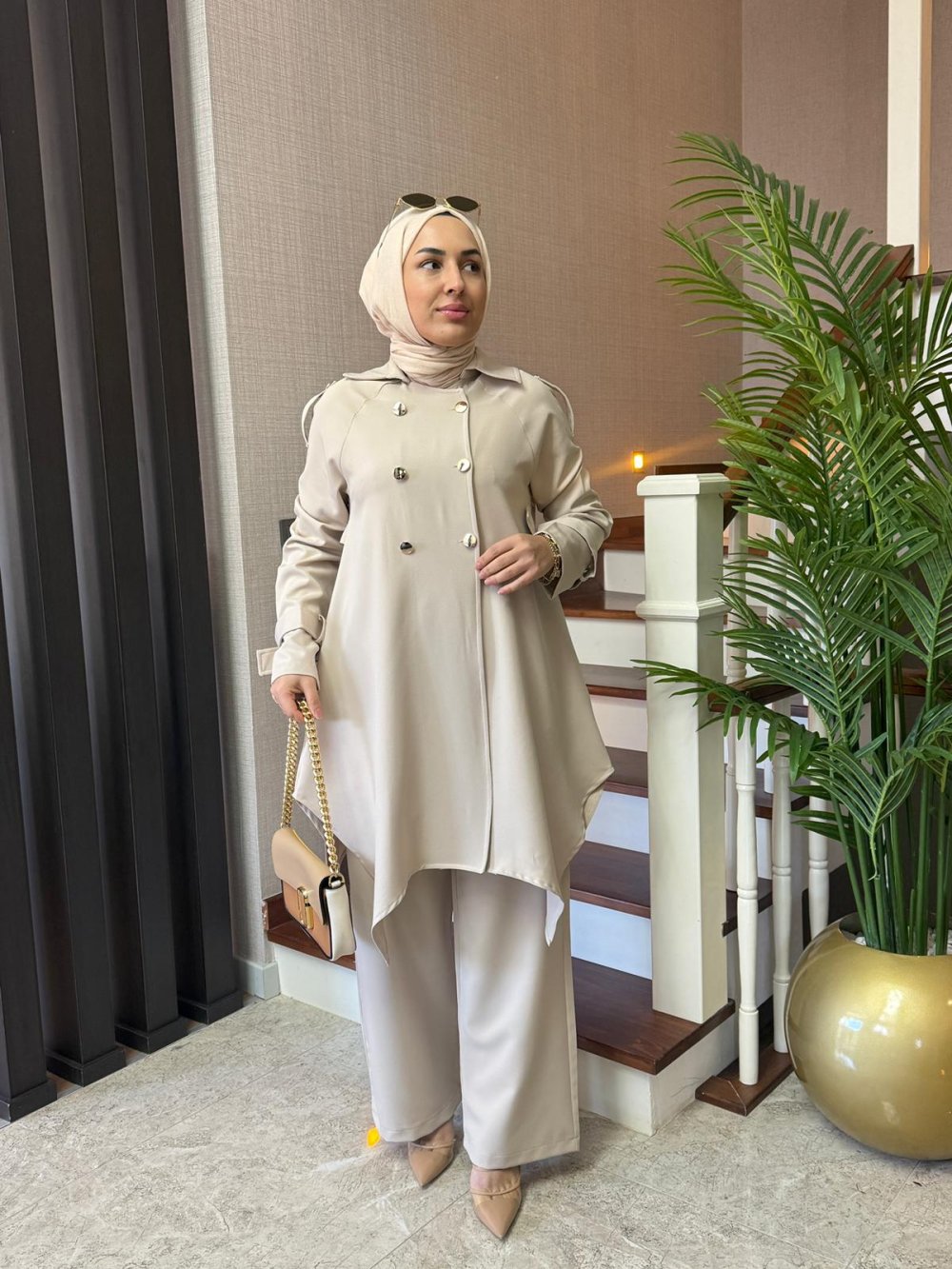Gold Düğmeli Double Krep Takım Bej