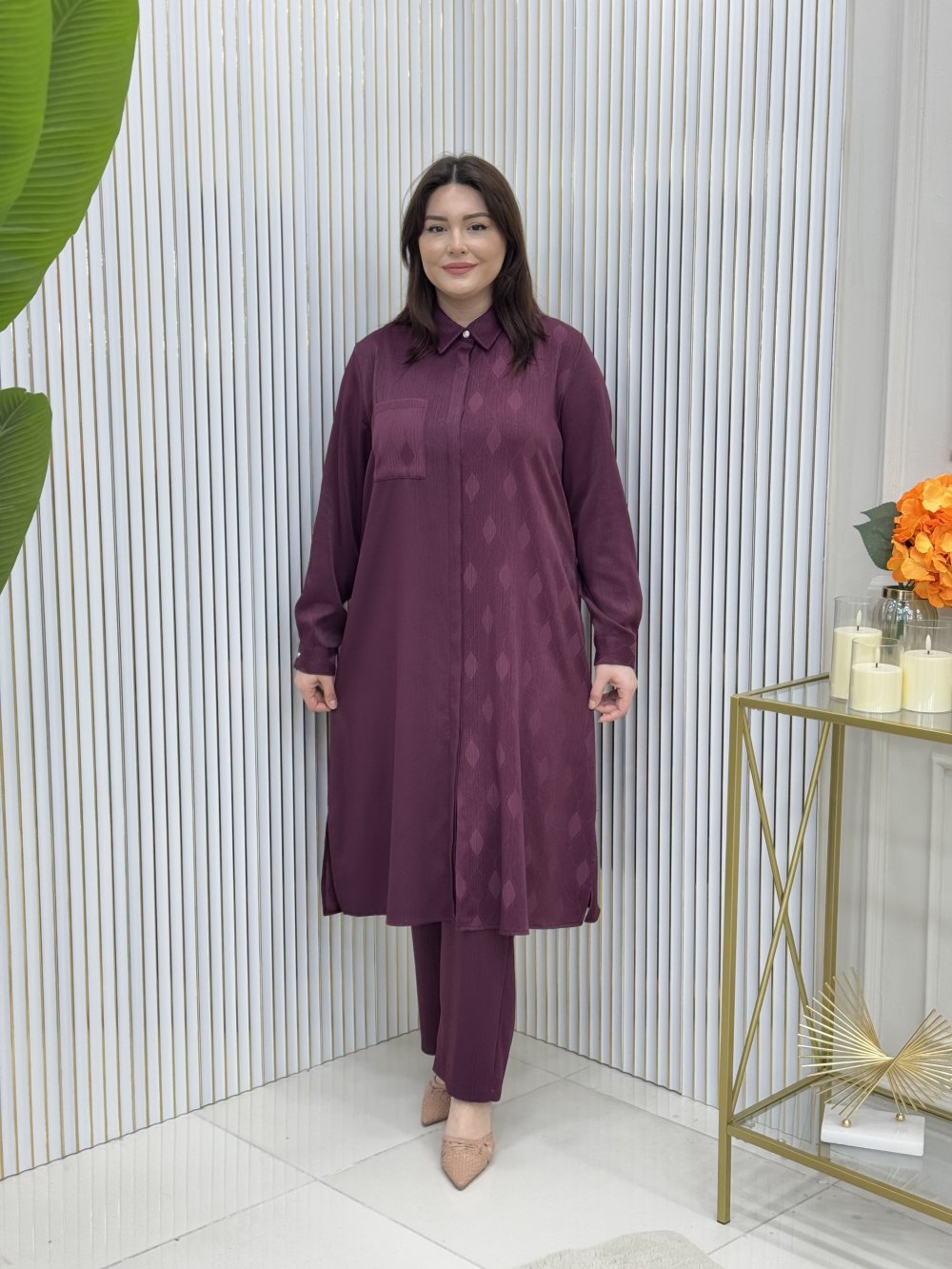 Tunik boydan düğmeli, kolları düğmeli.