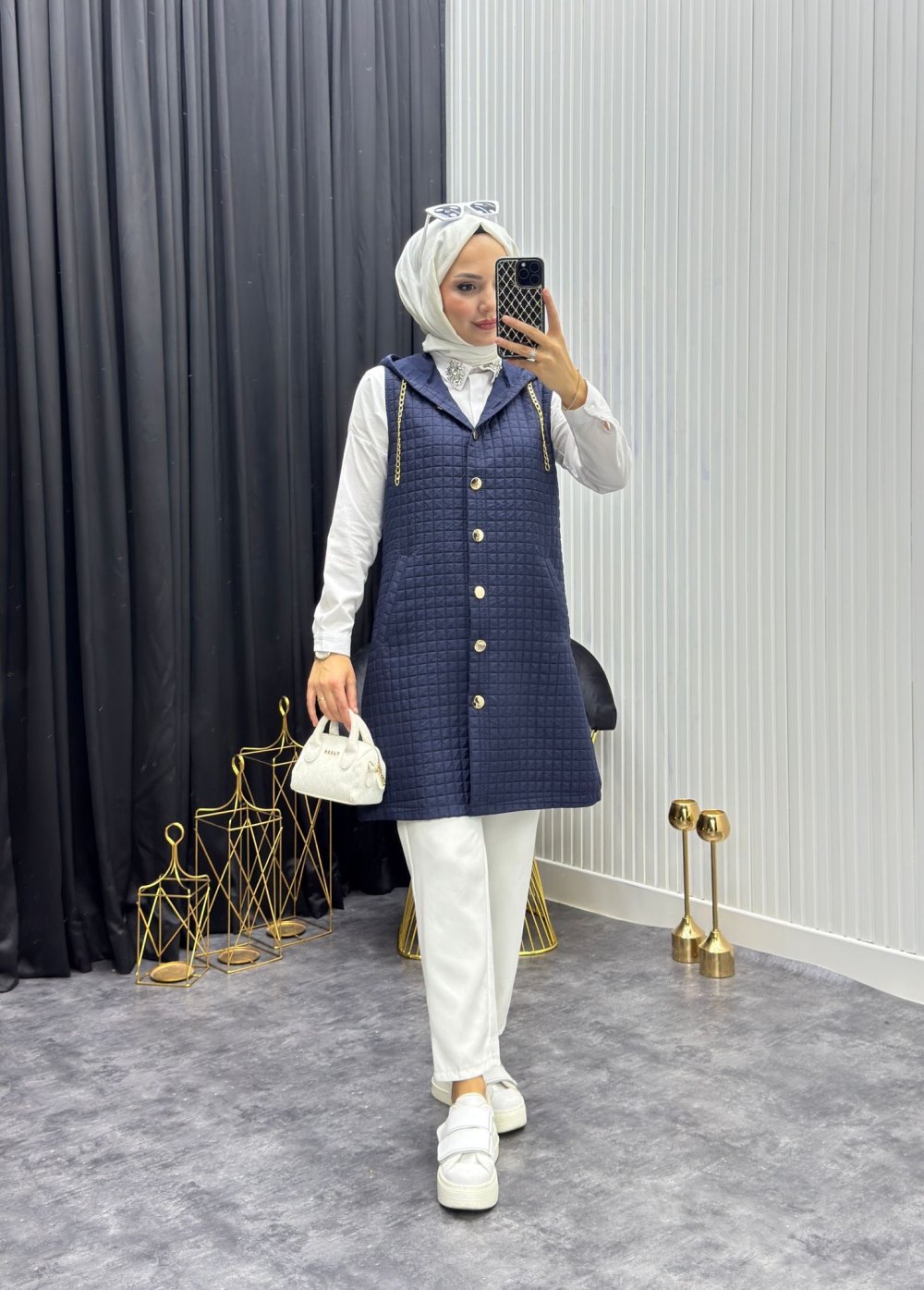 Boydan düğmeli ve kapüşonlu yandan cepli ve kapüşonesi zincir detaylı kapitone yelek