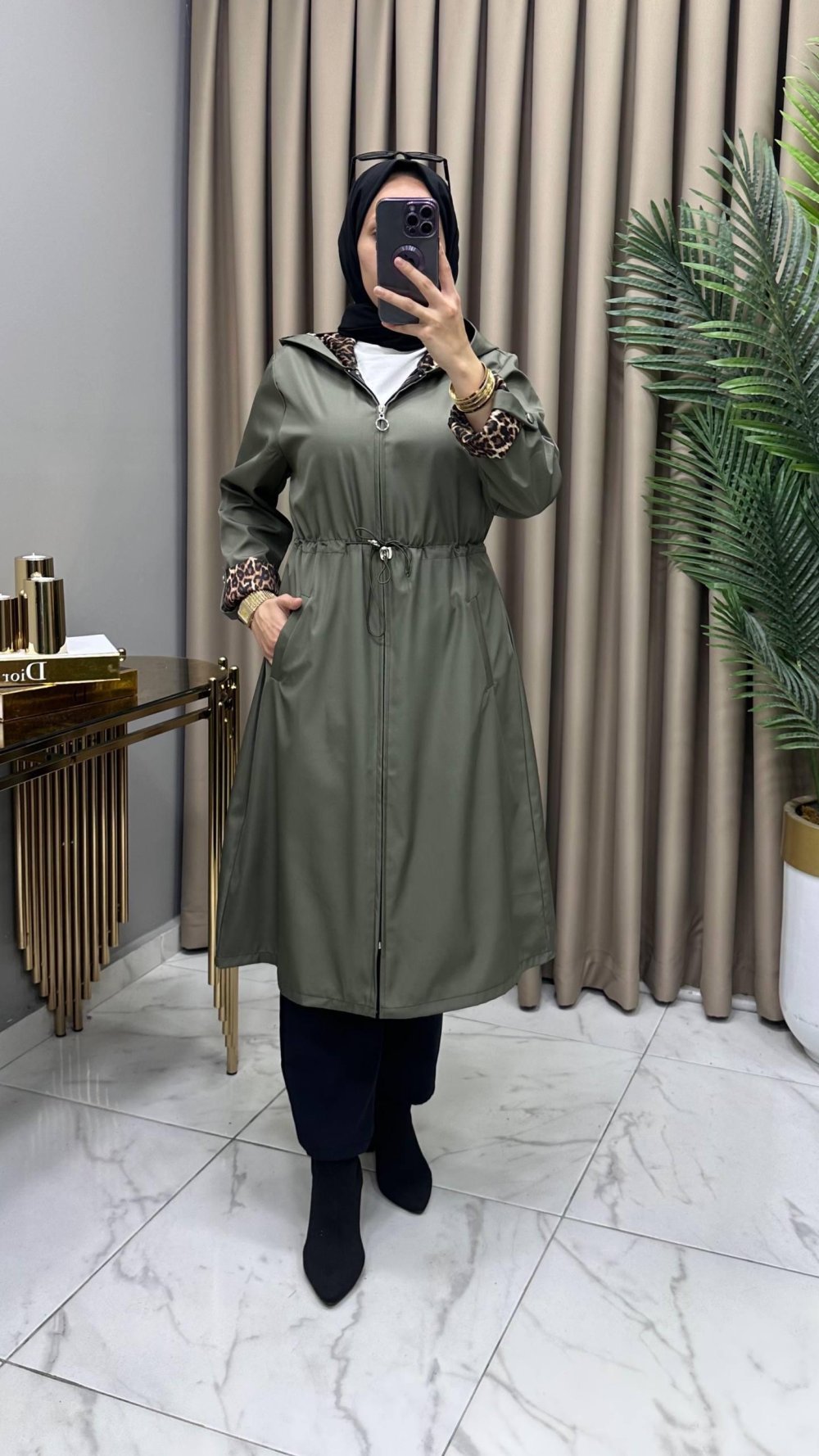 Leopar astarlı, cepli, fermuarlı , bağcıklı, kapşonlu. Boy 110 cm