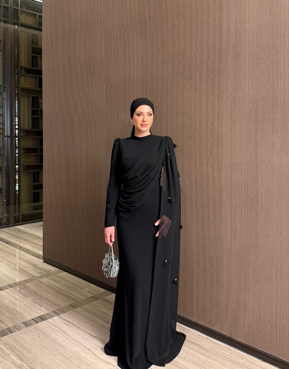 *Abiyenin pelerini çiçek detaylı, taşları çakım, arkası fermuarlı önü drape detaylıdır.