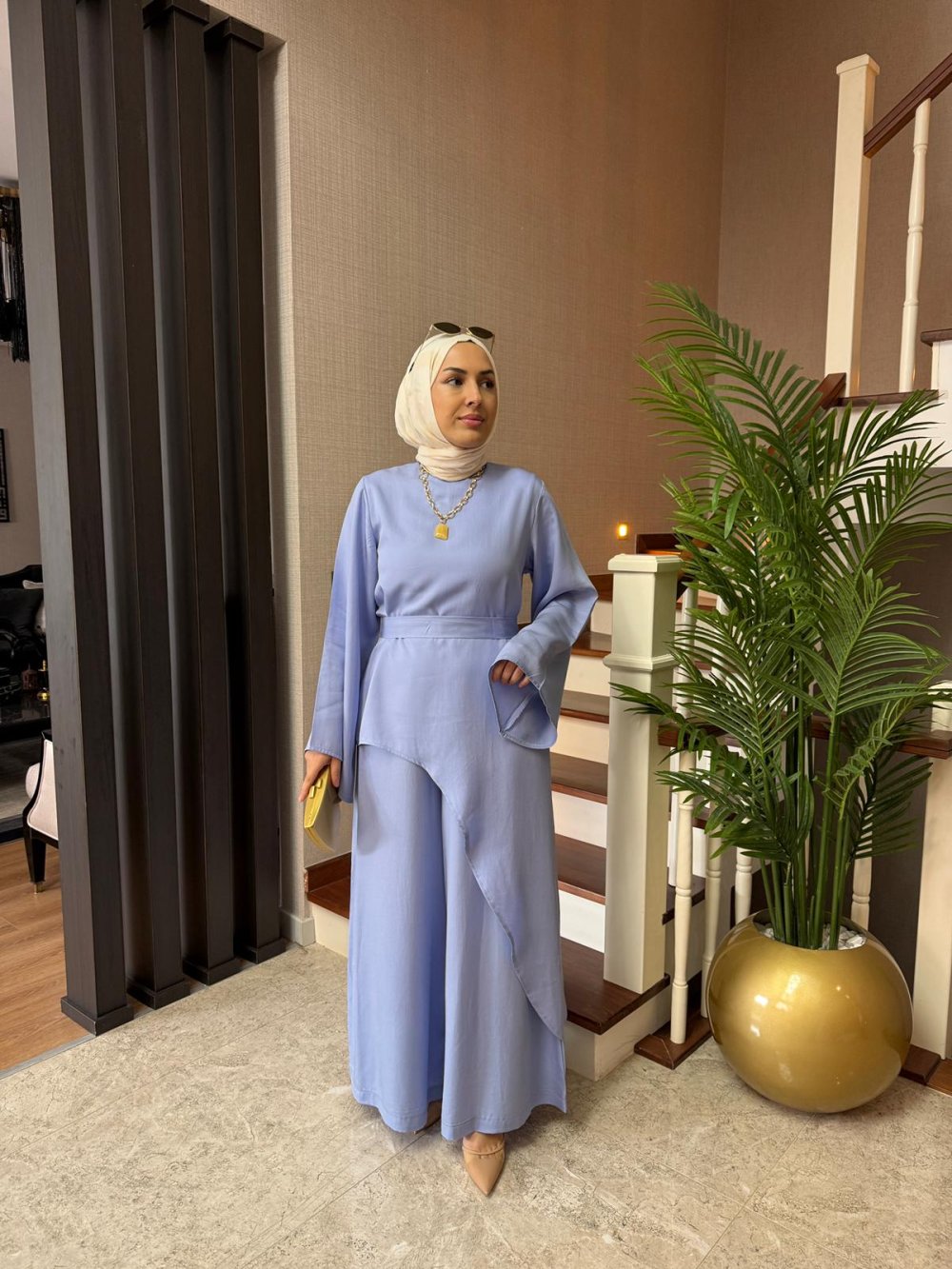 Pantolon boy 105 cm’dir. Önü kemerli, arkası lastiklidir. Pantolon etek formundadır.