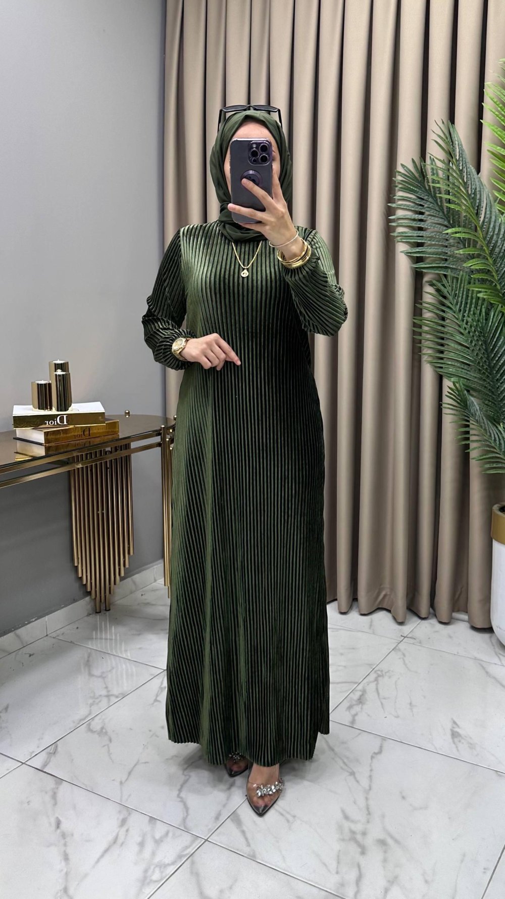 Multi Piliseli Kadife Elbise Haki