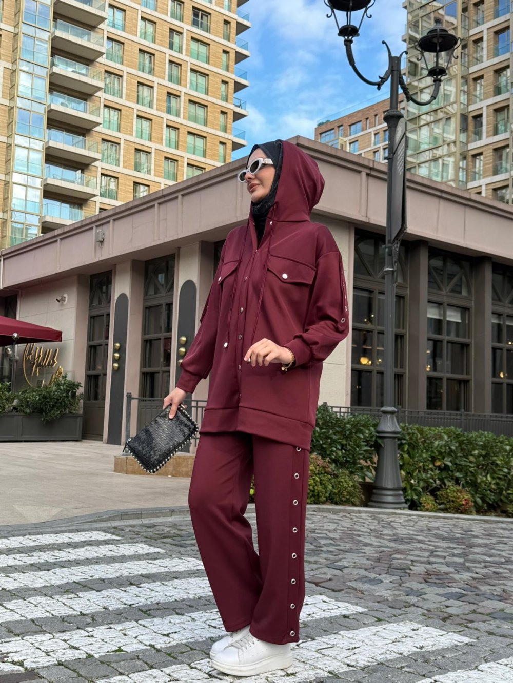 Kapüşonlu, pantolon beli lastikli.