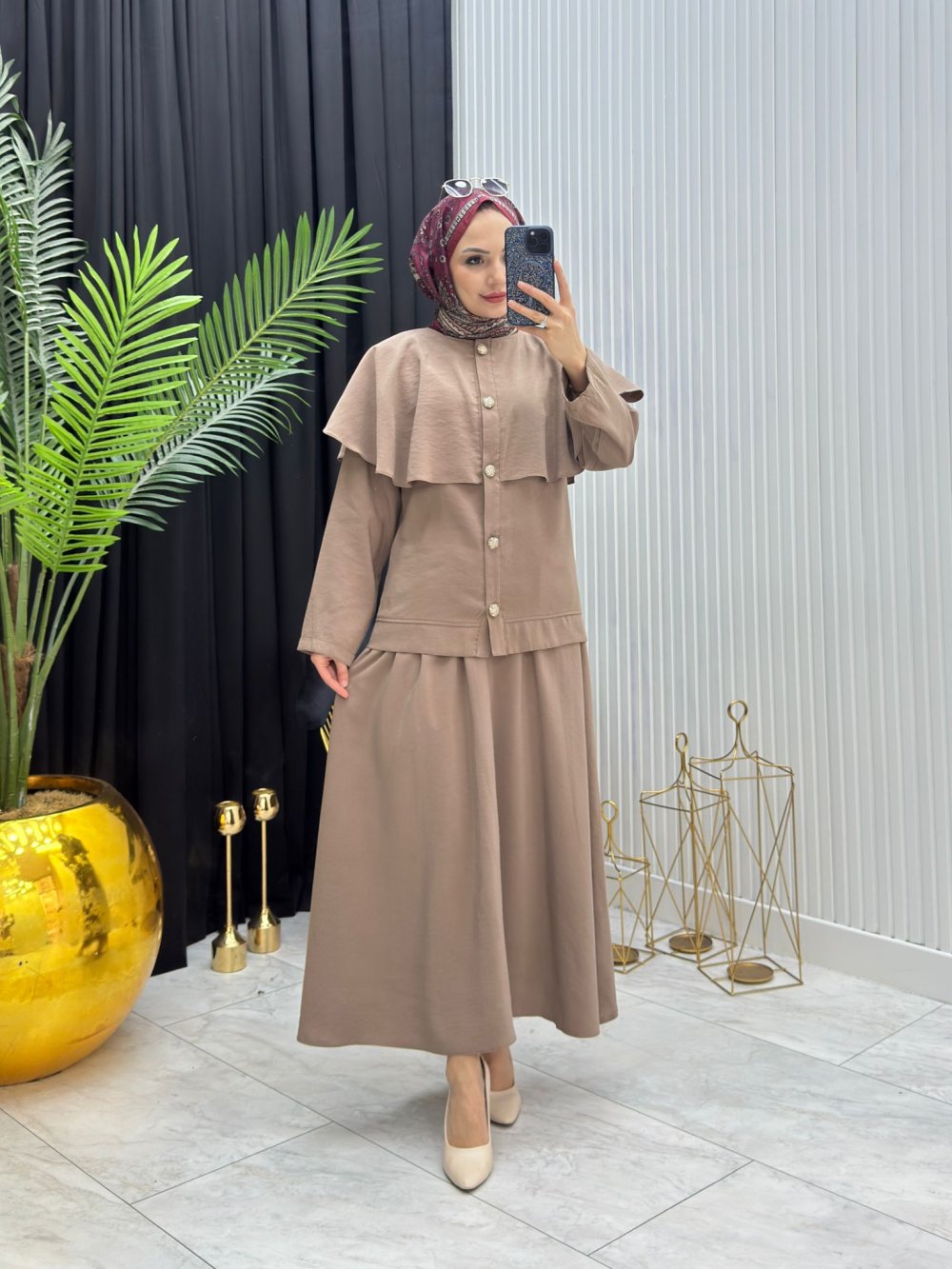 ☔️etek bluz olmak üzere 2 parçadan oluşmaktadır bluz önden düğmeli etek beli lastiklidir etek 90/95 cm dir