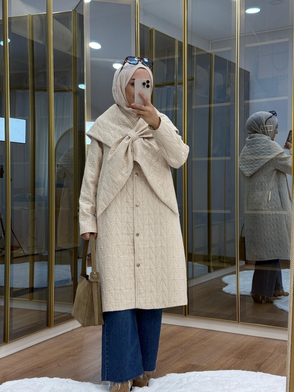 Şal Detaylı Kapitone Mont Bej